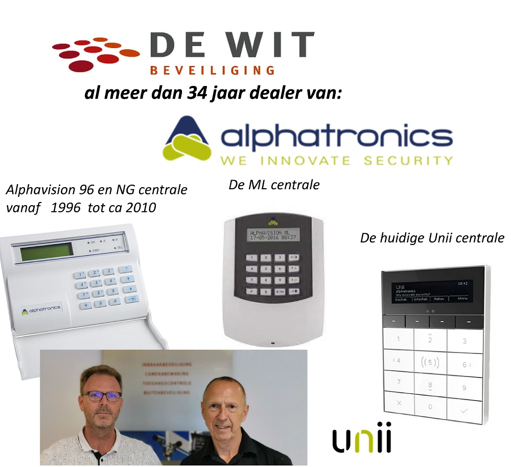 Al bijna 34 jaar werkt De Wit Beveiliging met de inbraakbeveiligings-centrales van Alphatronics.  Alphatronics is een Nederlandse fabrikant van inbraakbeveiligingscentrales.